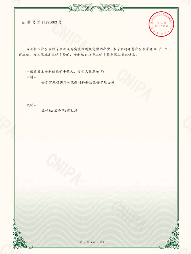 专利权人:哈尔滨鹏程药用包装新材料科技股份有限公司